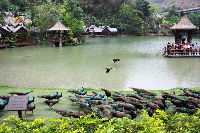 园内按四星级标准修建的孔雀山庄,以休闲度假中心形式设计建设,展现雨林怀抱中的绿色生活。山庄拥有客房51套,其中标准间45间,套房6间。水上餐厅能容纳200人同时进餐,可提供各类民族特色菜品和独具风情的傣家长桌宴。山庄内设有两间中型多功能会议厅,设有专业中控设备和音响设备,能够提供各种多媒体服务。